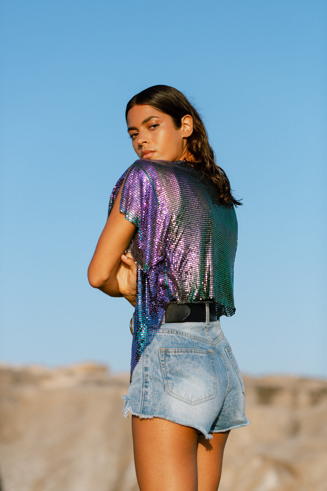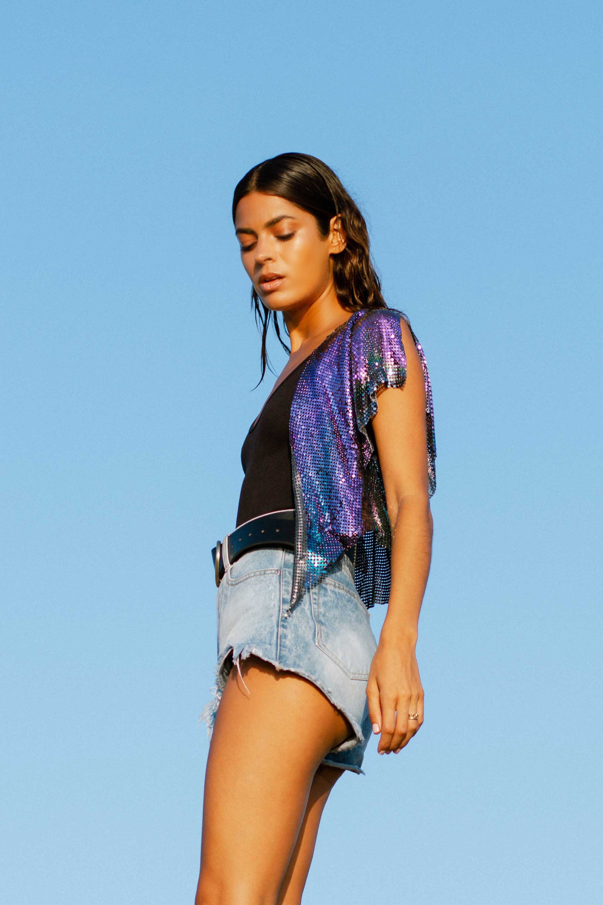 Iridescent metal waistcoat handwoven from recycled aluminium.