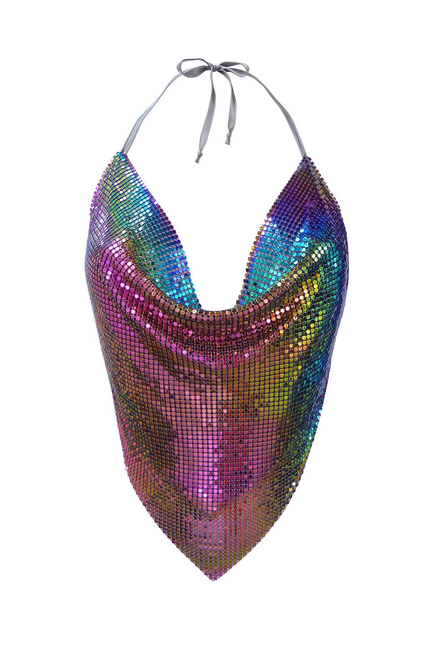 Iridescent halter-neck top with adjustable straps, handwoven from recycled aluminium.
