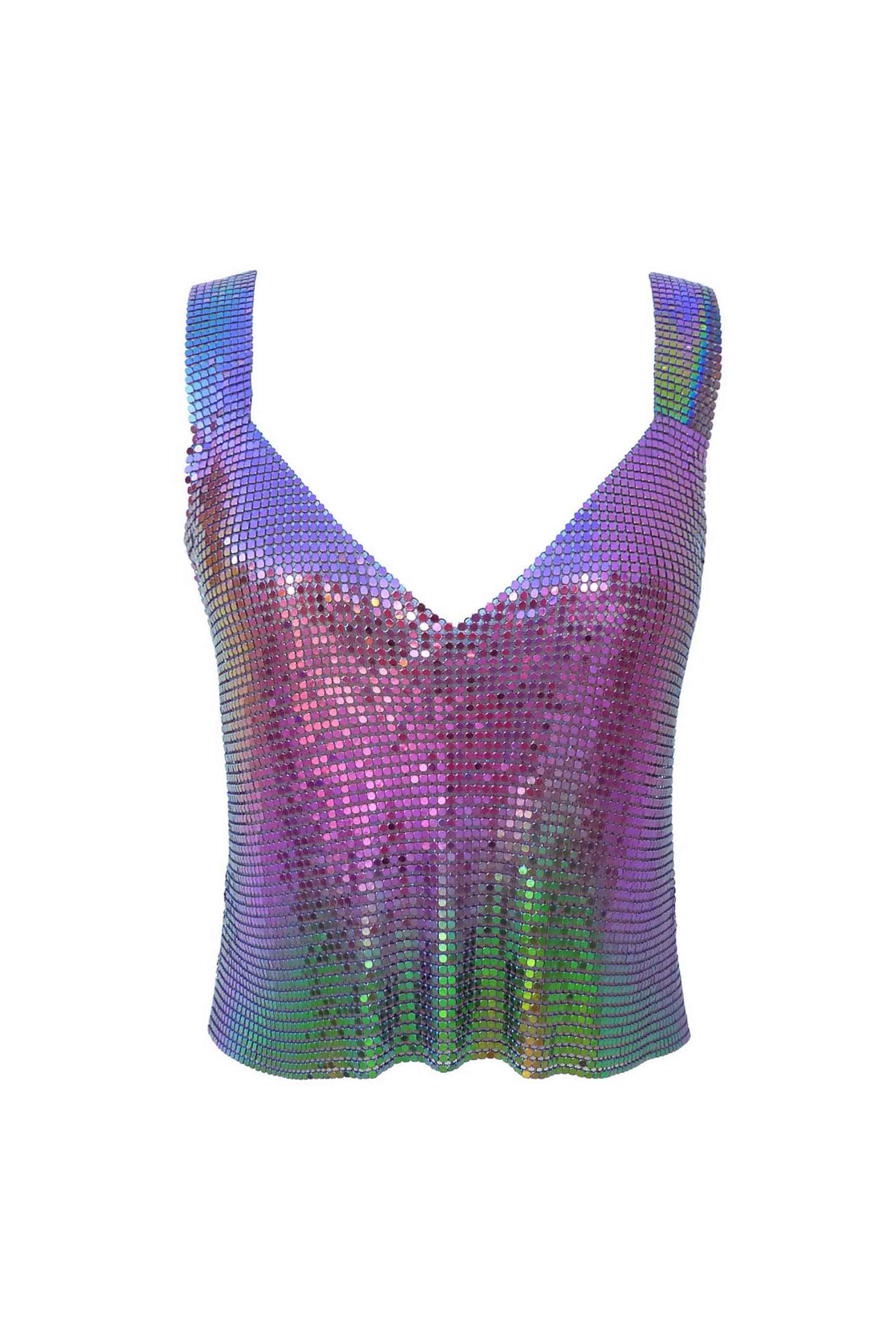 Iridescent metal v-neck top handwoven from recycled aluminium.